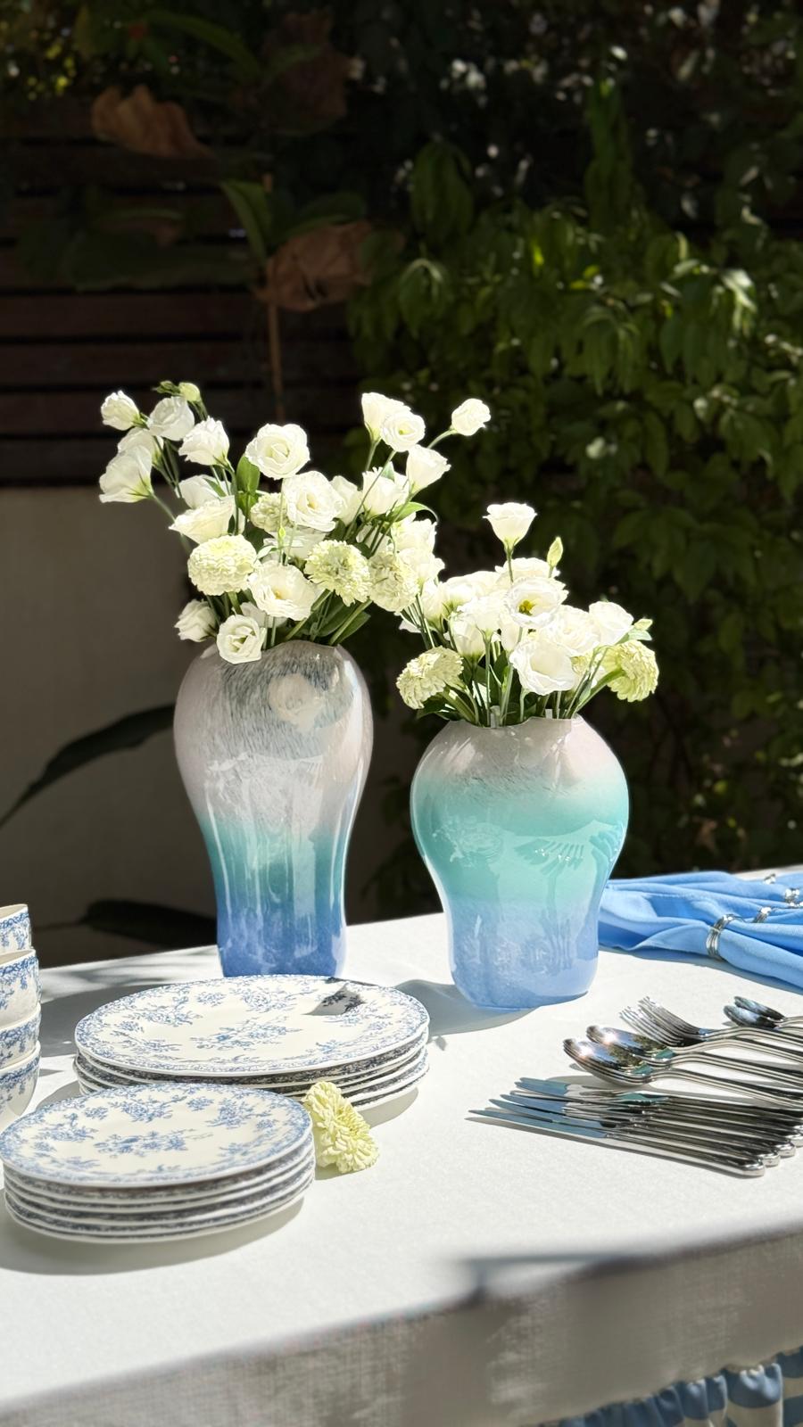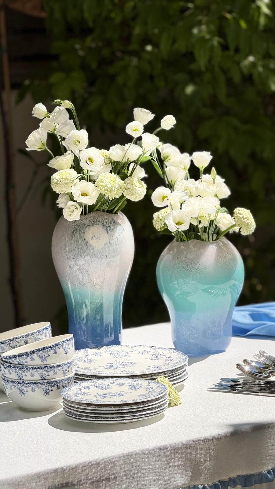אגרטל זכוכית מעוצב בסגנון אומברה ייחודי, המשתלב בין גווני כחול, טורקיז וורדרד עדין בחלקו העליון. העיצוב האלגנטי והמודרני הופך את האגרטל לפריט דקורטיבי מרשים, המתאים לשולחן אירוח חגיגי, סלון מעוצב או כמתנה יוקרתית לחובבי עיצוב הבית.