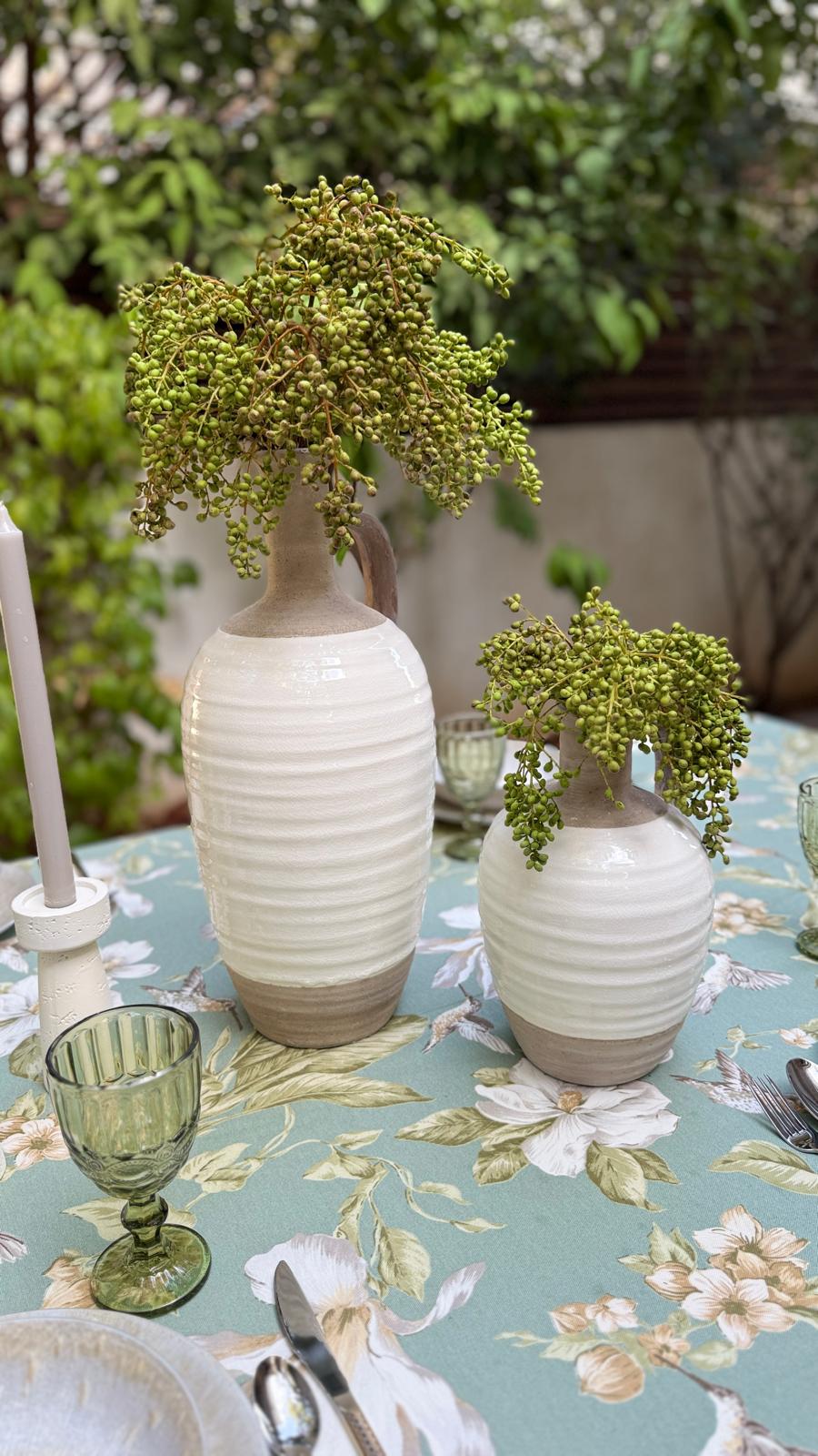 זוג כדים עשויים חרס איכותי בעבודת יד, המשלבים מראה טבעי־ כפרי עם נגיעות אלגנטיות של גלזורה לבנה בחלק העליון. השילוב בין החומר האדמתי לבין הגימור הלבן יוצר מראה אותנטי, חם ומזמין – כזה שמתאים לכל חלל, מהסלון ועד שולחן אירוח חגיגי.
