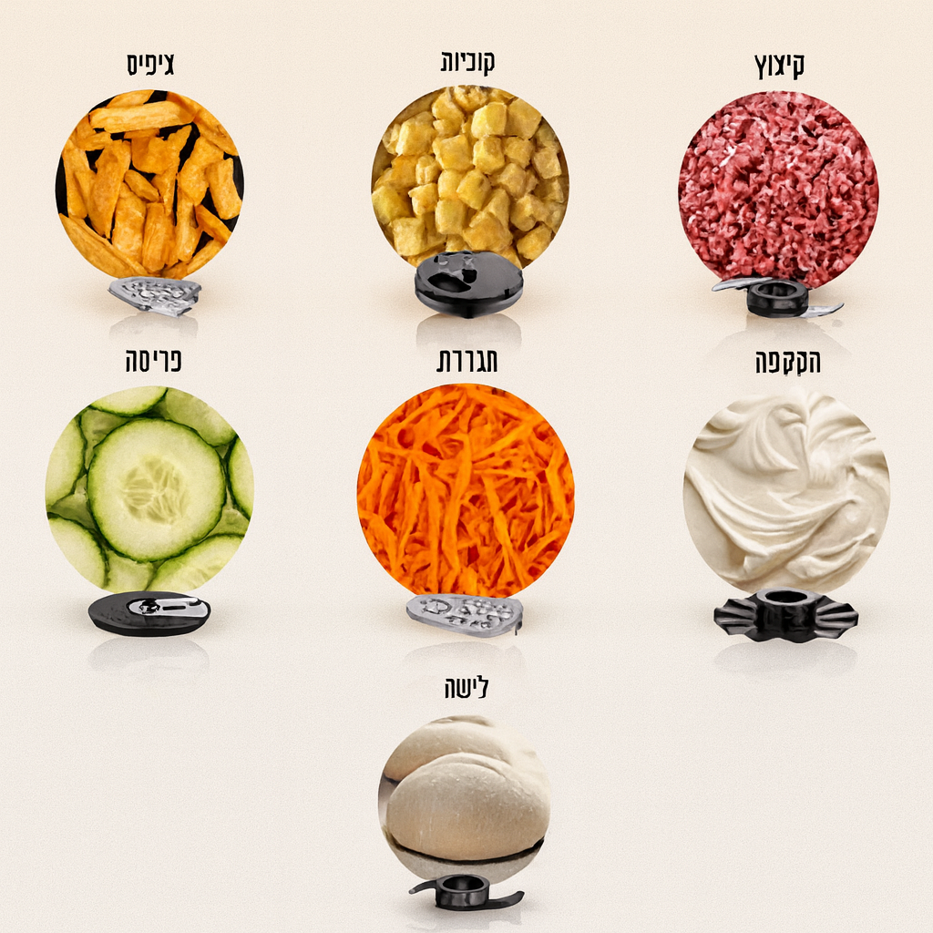 7 פעולות במכשיר 1 – לישה, צ’יפס, קיצוץ, מגרדת, פריסה, הקצפה והלהיט – חיתוך קוביות!