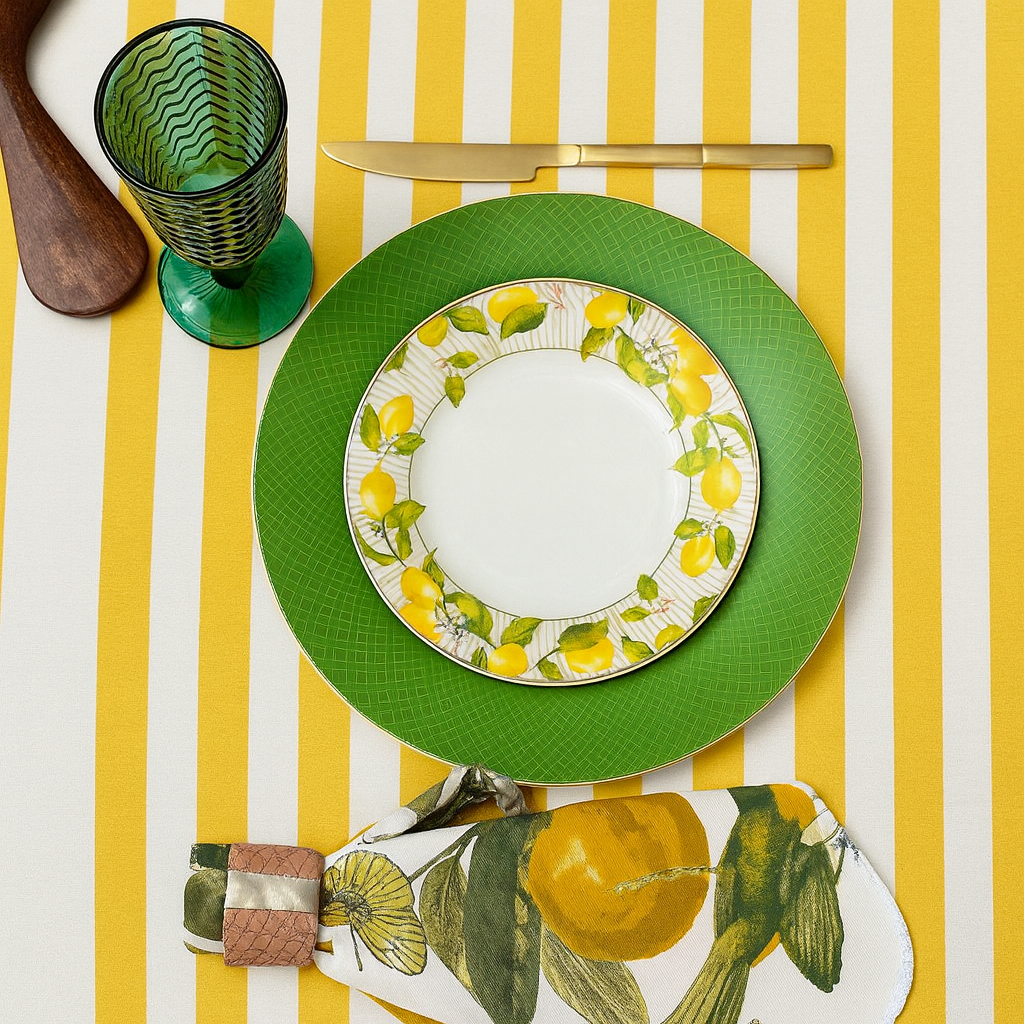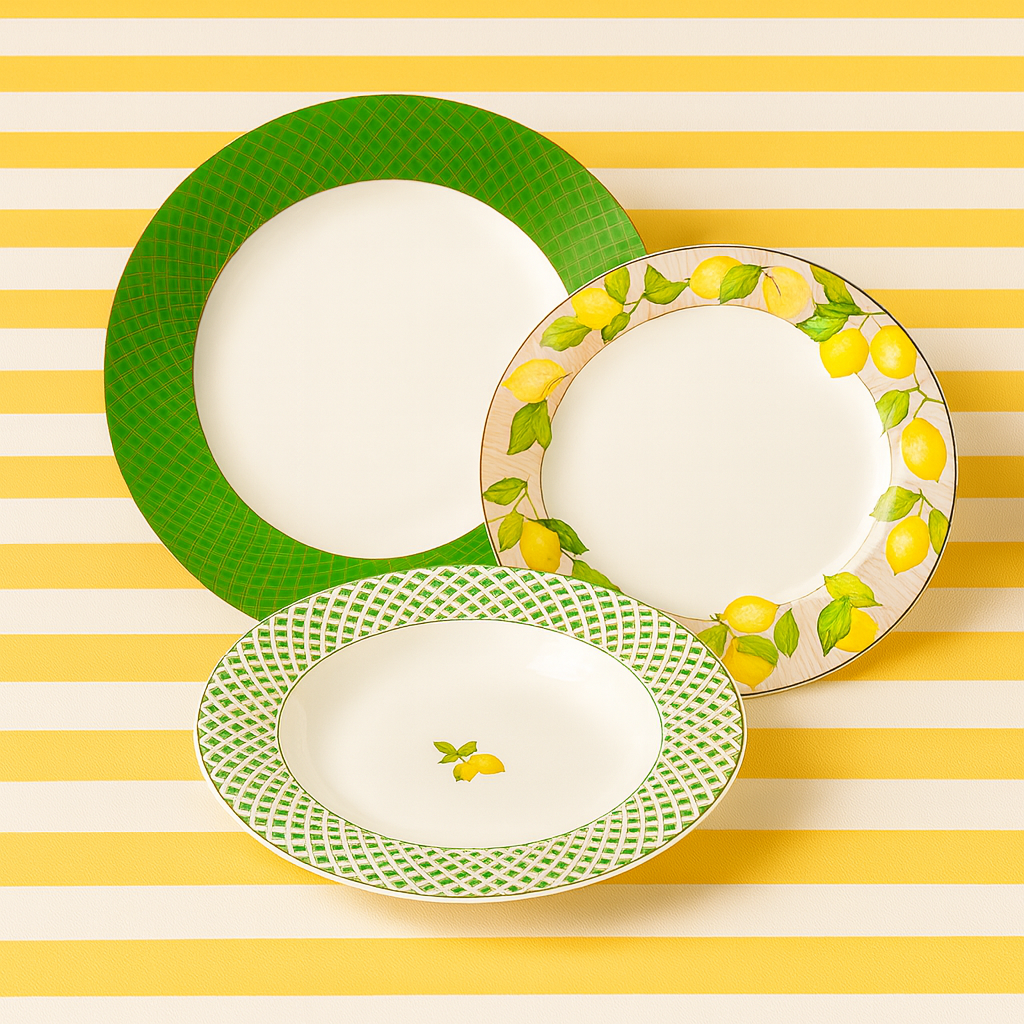 שלבו את מערכת Lemon עם מפת פסים צהובה-לבנה ואביזרי שולחן בירוק או זהב, כדי להעצים את מראה “גן הלימונים” וליצור חוויית אירוח בלתי נשכחת.