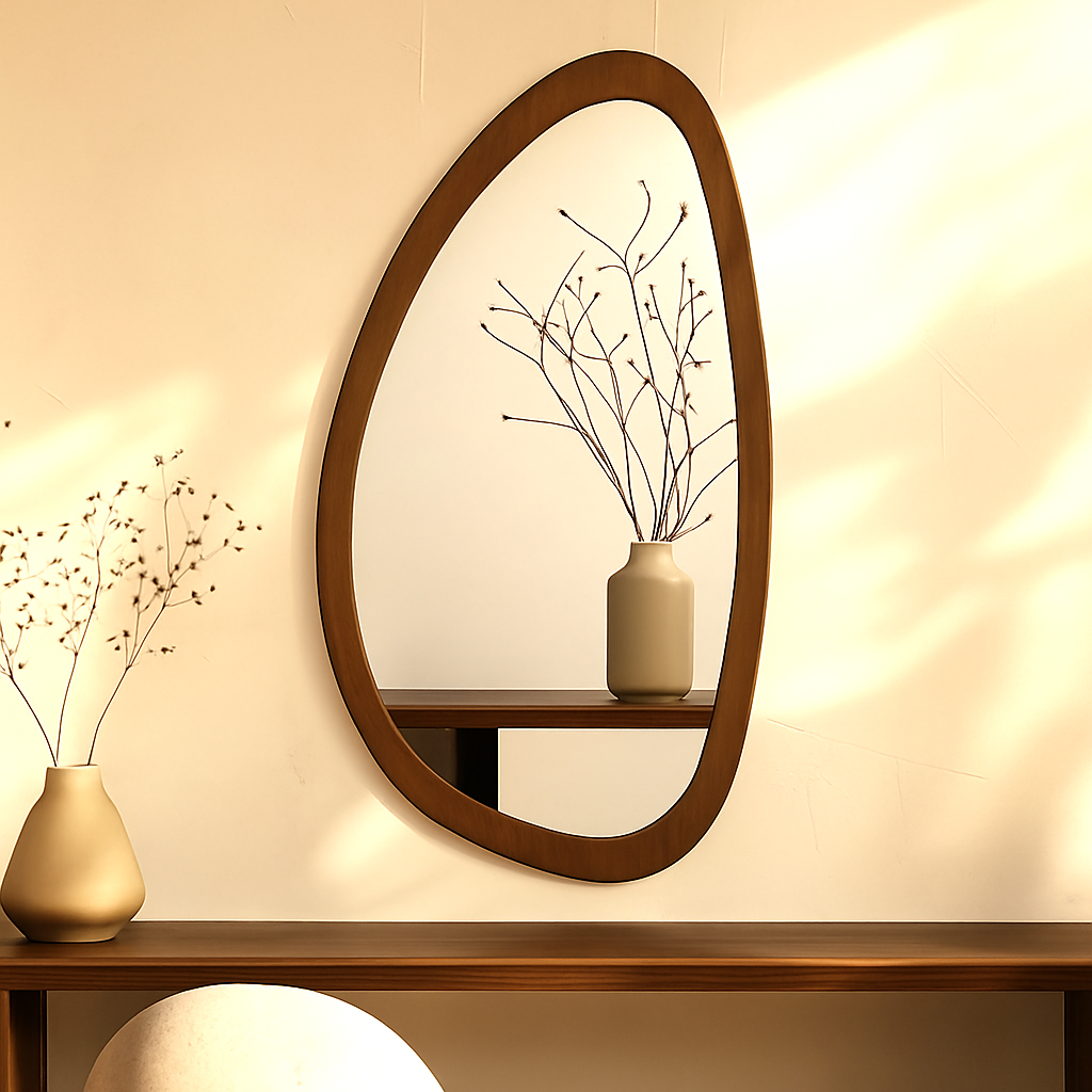 מראת קיר אמורפית מעץ טבעי/ אגוז – אלגנטיות רכה במראה טבעי ומעוצב