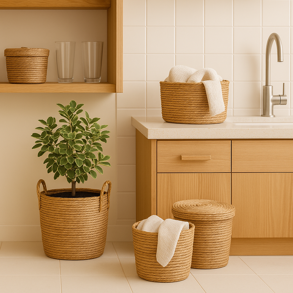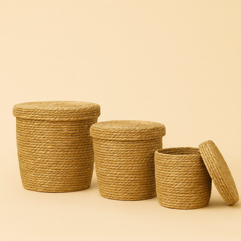 הסלסלות עשויות סיבי קש טבעיים בצבע זהוב-בהיר, עם מכסים תואמים השומרים על מראה נקי ואסתטי, ומתאימות במיוחד לאחסון במטבח, חדר הרחצה או הסלון.