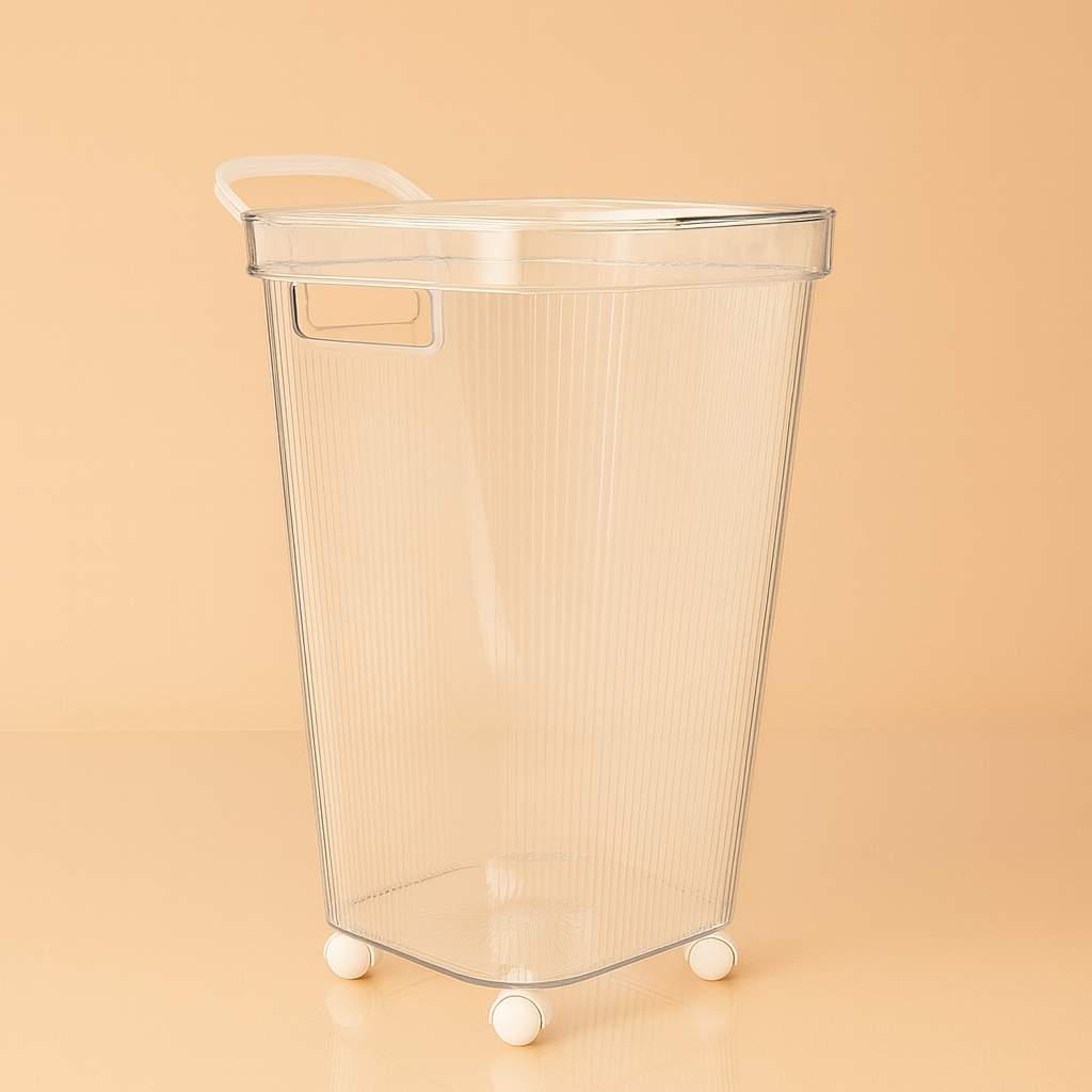 סל כביסה שקוף עם גלגלים ומכסה – פתרון אלגנטי ונייד לארגון הכביסה