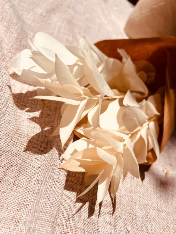 רוסקוס לבן מיובש הוא פרח טבעי עדין ומרשים שמביא עימו נוכחות שקטה ואלגנטית לכל עיצוב. הגבעולים הלבנים והחלקים מוסיפים מראה קליל ופריך, והם משתלבים נהדר עם פרחים אחרים או כזר עצמאי.