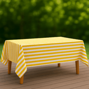 מפה בפסים צהובים–לבנים יוצרת בסיס קייצי ואופטימי, שמאיר את כל חלל האירוח.