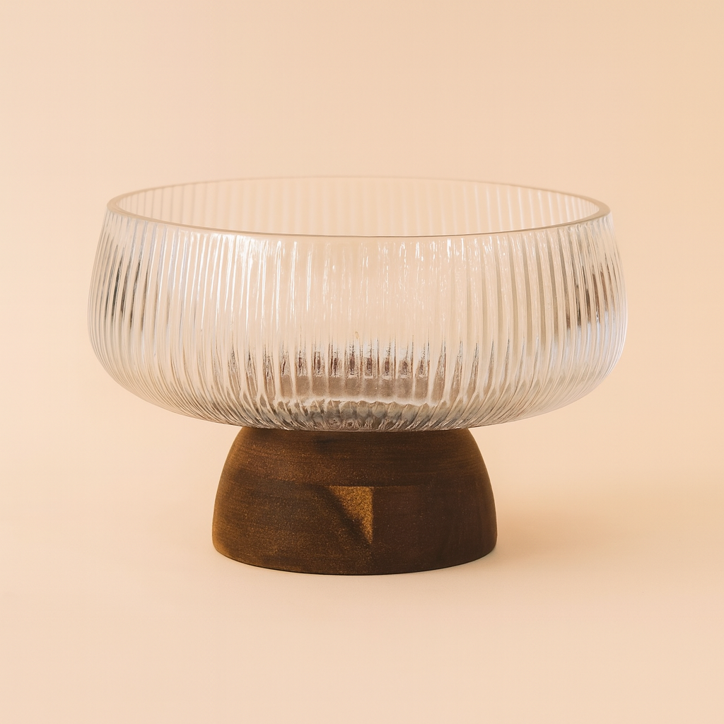קערה אלגנטית בעיצוב ייחודי המשלב זכוכית שקופה במרקם מחורץ עדין עם רגל מעץ טבעי בגוון אגוז חם. השילוב בין החומרים יוצר מראה הרמוני, נקי ומוקפד – כזה שמתאים לכל סגנון עיצובי, מקלאסי ועד מודרני.