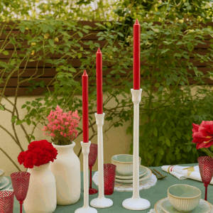 המפה הירוקה יוצרת בסיס עמוק ויוקרתי, כוסות אדומות מוסיפות נגיעה חמה ומפתיעה, והפרחים האדומים משלימים את המראה בנוכחות מושלמת.