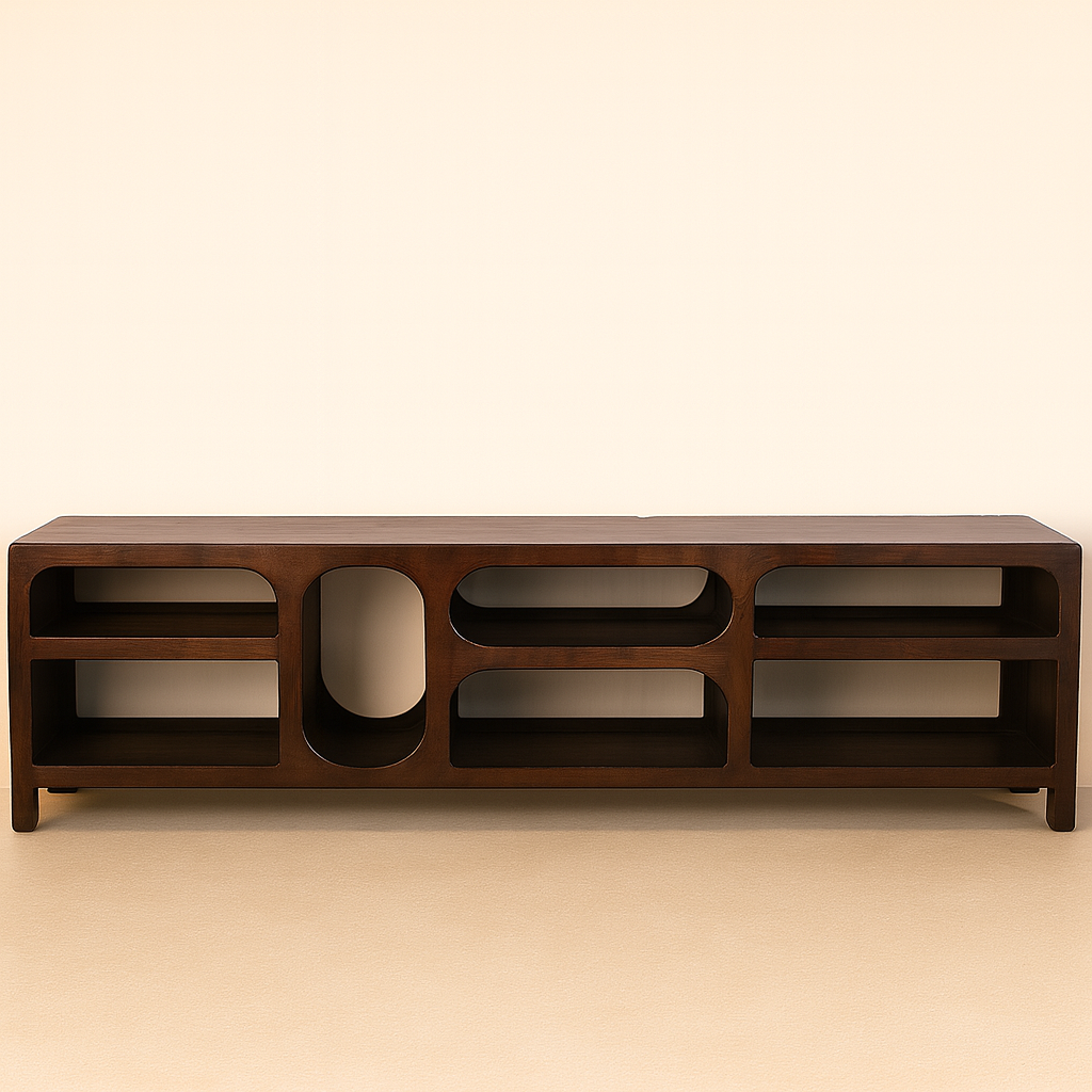 שידת TV אושר רחבה בעיצוב מודרני ומרשים, עשויה עץ מנגו מלא בגוון חום עמוק וטקסטורה טבעית ייחודית. השידה משלבת בין פונקציונליות גבוהה לבין עיצוב אלגנטי, והופכת בקלות למוקד עיצובי מרכזי בסלון.
