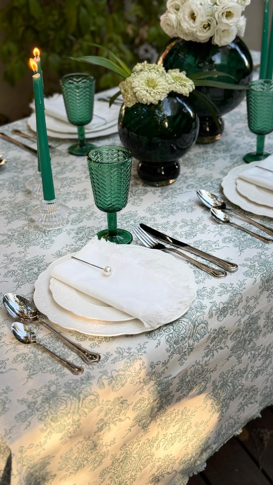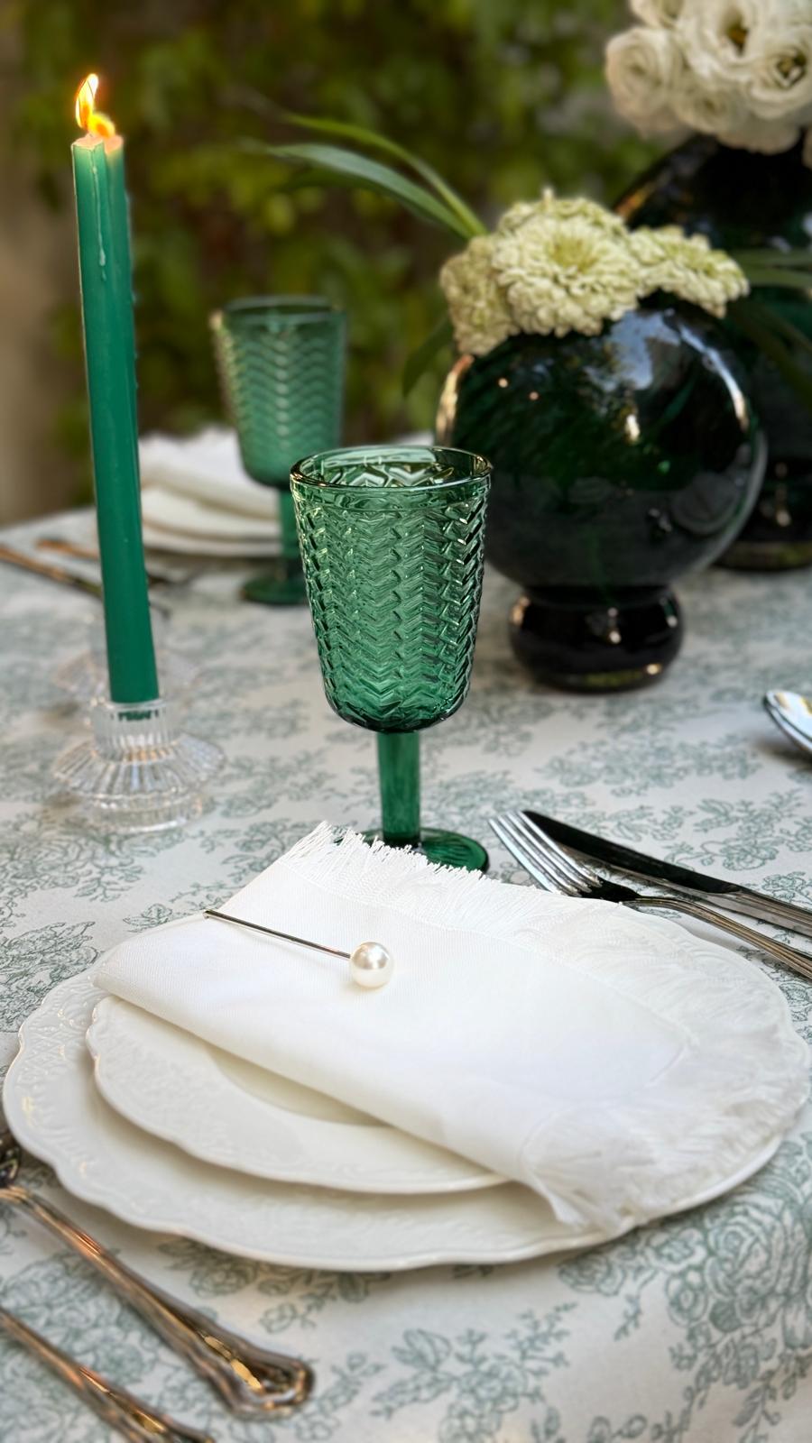 לשולחן ערב חגיגי, שלבו את כוסות רויאל ירוק עם מפות פשתן בגווני קרם וכלי קרמיקה לבנים. הוסיפו נרות גבוהים או פרחים לבנים לקבלת מראה אלגנטי, נקי ומרשים.